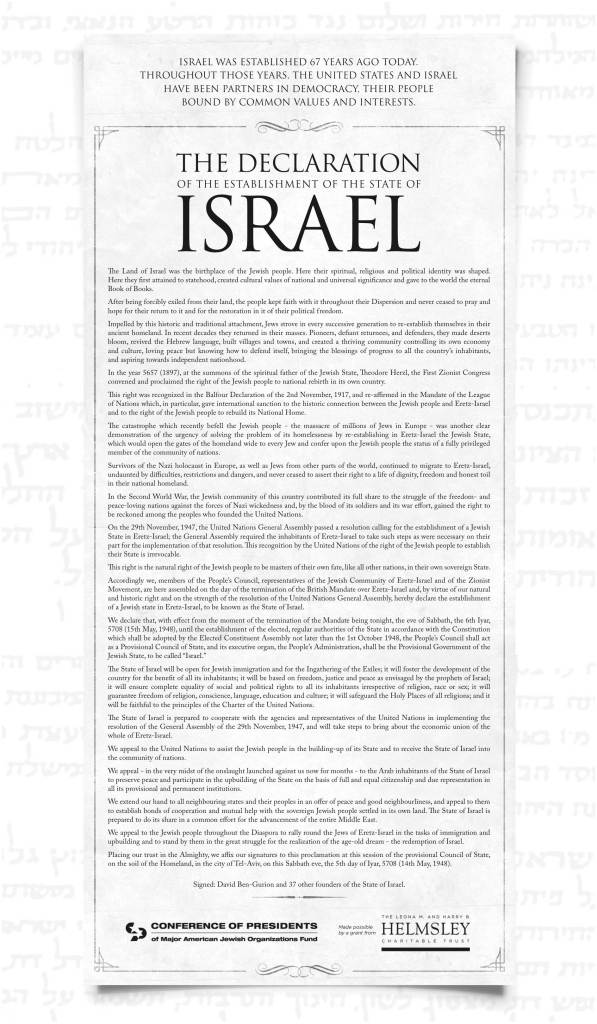 They are sponsoring a full-page reproduction of the Declaration of the Establishment of the State of Israel in newspapers across the country (Wall Street Journal, USA Today, LA Times, and Washington Post) in honor of Israel’s Independence Day.