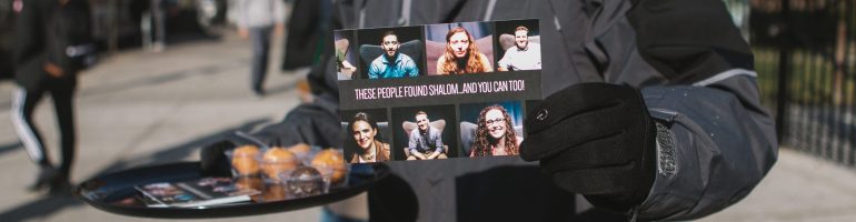 I handed an “I Found Shalom” tract [that has a link to our “I Found Shalom” video testimonies] to a 30-year-old Israeli man who said, “I am looking for shalom.” I said, “I have found shalom . . .” We were able to share our testimonies and also how God loved us enough to sacrifice His only Son, Yeshua, the spotless Lamb once and for all, for our sins.